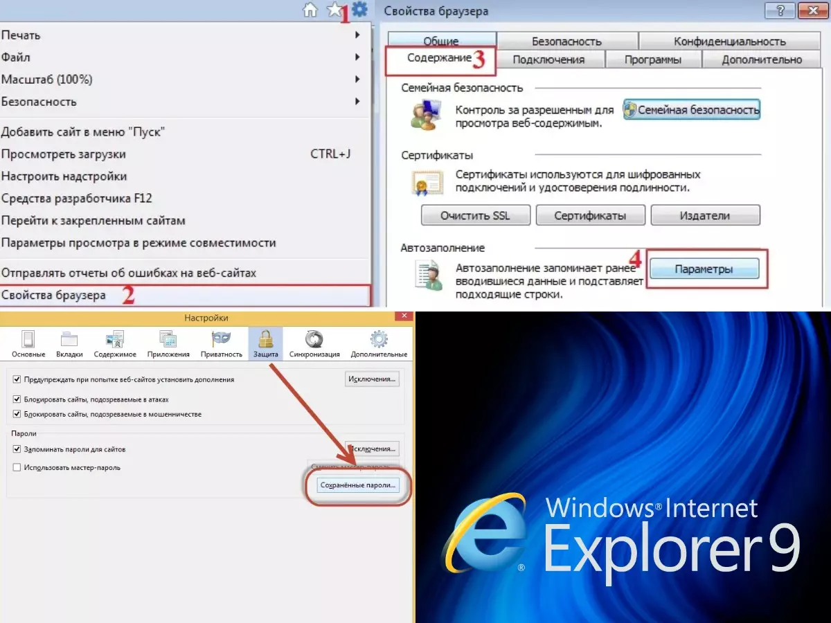 Данный браузер автоматически устанавливается на ОС Windows. Для того, чтобы посмотреть сохраненные пароли, необходимо в меню Internet Explorer перейти в «Свойства». После этого перейти в «Содержание». В открытой вкладке отобразить «Параметры». В меню «Использовать автозаполнение для» выбрать «Управление паролями».